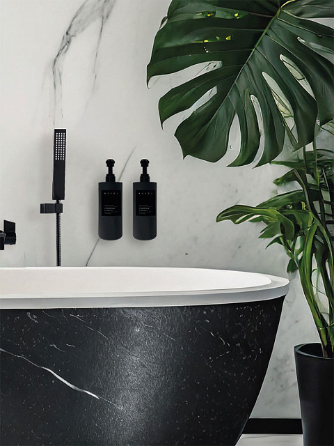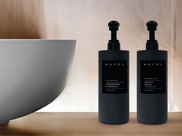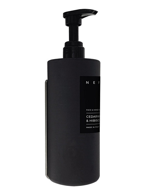 Držač za NEFÉL sapun, šampon, losion i regenerator je praktičan i elegantan držač za NEFÉL dozere zapremine 480 ml, minimalističkog dizajna, crne boje, napravljen od 100% recikliranog polipropilena sa teksturom protiv otisaka prstiju. Može se koristiti kao samostojeći držač ili montirati na zid praktično nevidljivim nosačem od nerđajućeg čelika, bilo šrafljenjem ili obostrano lepljivom trakom. Etiketa sa prednje strane držača po potrebi se može prilagođavati.
