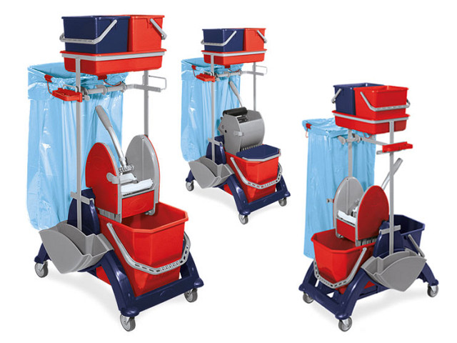 Višenamenska profesionalna kolica za čišćenje zatvorenog tipa, modularna i prilagodljiva, ergonomična, kompaktna i stabilna pri punom opterećenju.