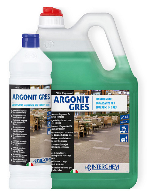 Odmašćivač za održavanje kamenih površina ARGONIT GRES je mirisno sredstvo namenjeno čišćenju i održavanju kamenih podova i drugih podova tvrdih površina, kao i dubinskom čišćenju mikroporoznih podnih površina. Idealan je za spoljašnje i unutrašnje podove restoranana, hotela, poslovnih prostora, čekaonica i drugih mesta sa velikom frekvencijom posetilaca, gde postoji potreba za uklanjanjem postojanih nečistoća različitih vrsta. Upotrebljava se rastvoren u vodi, po potrebi u koncentraciji od 1% do 5%, sa mopom ili mašinom za čišćenje podova. Ne zahteva ispiranje.