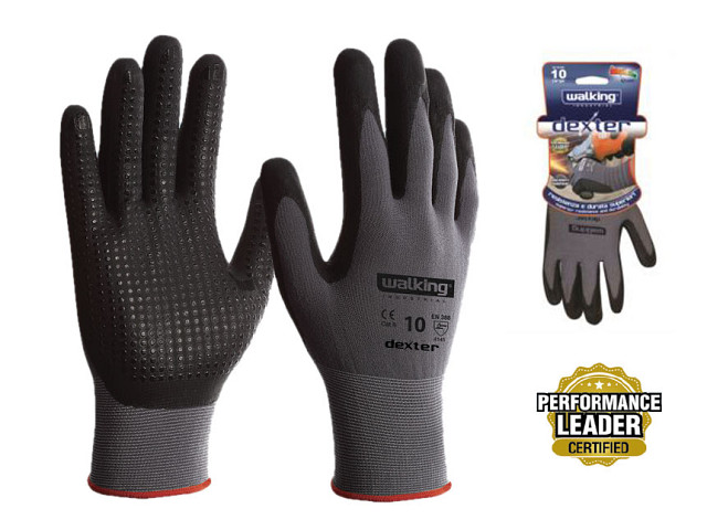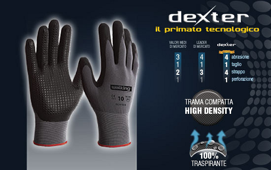 Precizne zaštitne rukavice DEXTER obezbeđuju izuzetnu preciznost i spretnost u radu, osetljivost i udobnost, odličnu mehaničku i dobru hemijsku zaštitu. Ove industrijske rukavice napravljene su od tankih pletenih niti elastičnog najlona velike gustine i presvučene slojem nitrilne mikro pene sa neklizajućim reljefom na dlanu i prstima. Elastična traka oko zgloba, ventilirajuća gornja strana i unutrašnjost bez šavova obezbeđuju udobno korišćenje DEXTER zaštitnih rukavica u dužem vremenskom periodu, bez zamora ruku. Otporne na ulja, maziva i masnoće, ali i kiseline i hidrokarbonate, ove rukavice pružaju dobru hemijsku zaštitu ali se ne preporučuju za duže neprekidne kontakte sa oksidirajućim kiselinama, azotnim jedinjenjima i rastvaračima na bazi ketona (npr. aceton).