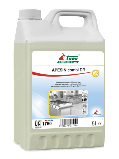 Sredstvo za čišćenje i dezinfekciju APESIN COMBI DR je višenamensko sredstvo za čišćenje i dezinfikovanje svih vodoperivih površina. Sredstvo je bez mirisa, poseduje odličnu moć odmašćivanja, lako se ispira i ne oštećuje površine na koje se primenjuje. Posebno je efikasan u održavanju higijene u kuhinji i drugim objektima za preradu i pripremu hrane, kao i u održavanju higijene u bolnicama i drugim zdravstvenim ustanovama.