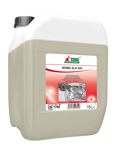 Sredstvo za industrijsko čišćenje NOWA SLR 600 je veoma efikasno sredstvo za čišćenje velikih površina otpornih na kisele rastvore, pre svega u kuhinjama i pogonima za preradu hrane, ali i u toaletima, prostorijama za tuširanje i sl. Ovo hemijsko sredstvo, koje se odlikuje obilnom i postojanom penom, uklanja naslage masnoće, vodenog kamenca, sapuna, tvrdokorne prljavštine, rđu i druge mineralne nečistoće, ne izaziva koroziju i oštećenja na hromiranim slavinama i drugim hromiranim elementima ali se ne sme koristiti na mermernim, bakarnim, aluminijumskim i loše hromiranim površinama.