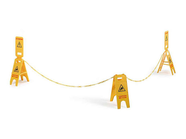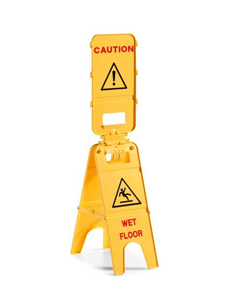 Trodelni znak upozorenja na mokar i klizav pod je znak koji se koristi za vreme i neposredno nakon čišćenja poda kao upozorenje da je pod mokar i klizav. Ovaj znak upozorenja napravljen je od plastike otporne na udarce i opremljen je kukicama za kačenje plastičnih lančića kojima se može povezati više znakova i tako obeležiti prostor na koji se upozorenje odnosi. Trodelni znak upozorenja na mokar i klizav pod se lako sklapa i prenosi, bilo ručno ili okačen na kolica za čišćenje. Znak je jarke boje i na njemu se, pored upozorenja "OPREZ, MOKAR POD", nalazi i univerzalno razumljiv i iz daljine vidljiv crtež koji ilustruje moguću opasnost od mokrog i klizavog poda.